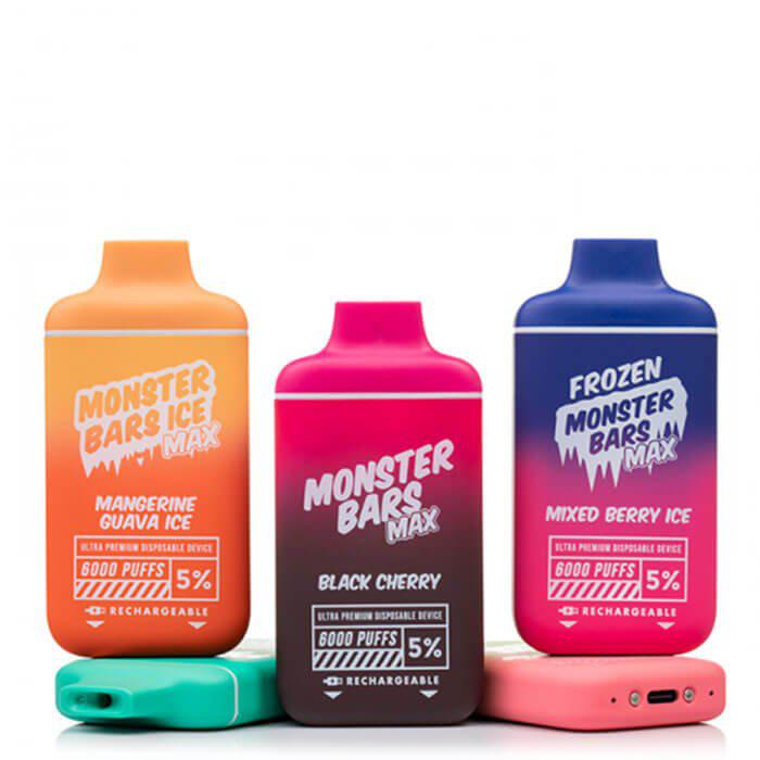 The Monster Bars MAX 6000 Disposable Vape lasts for approximately 6000 puffs, has a built-in 550mAh rechargeable battery, has 12mL of eliquid and is 50mg of nicotine.Â
